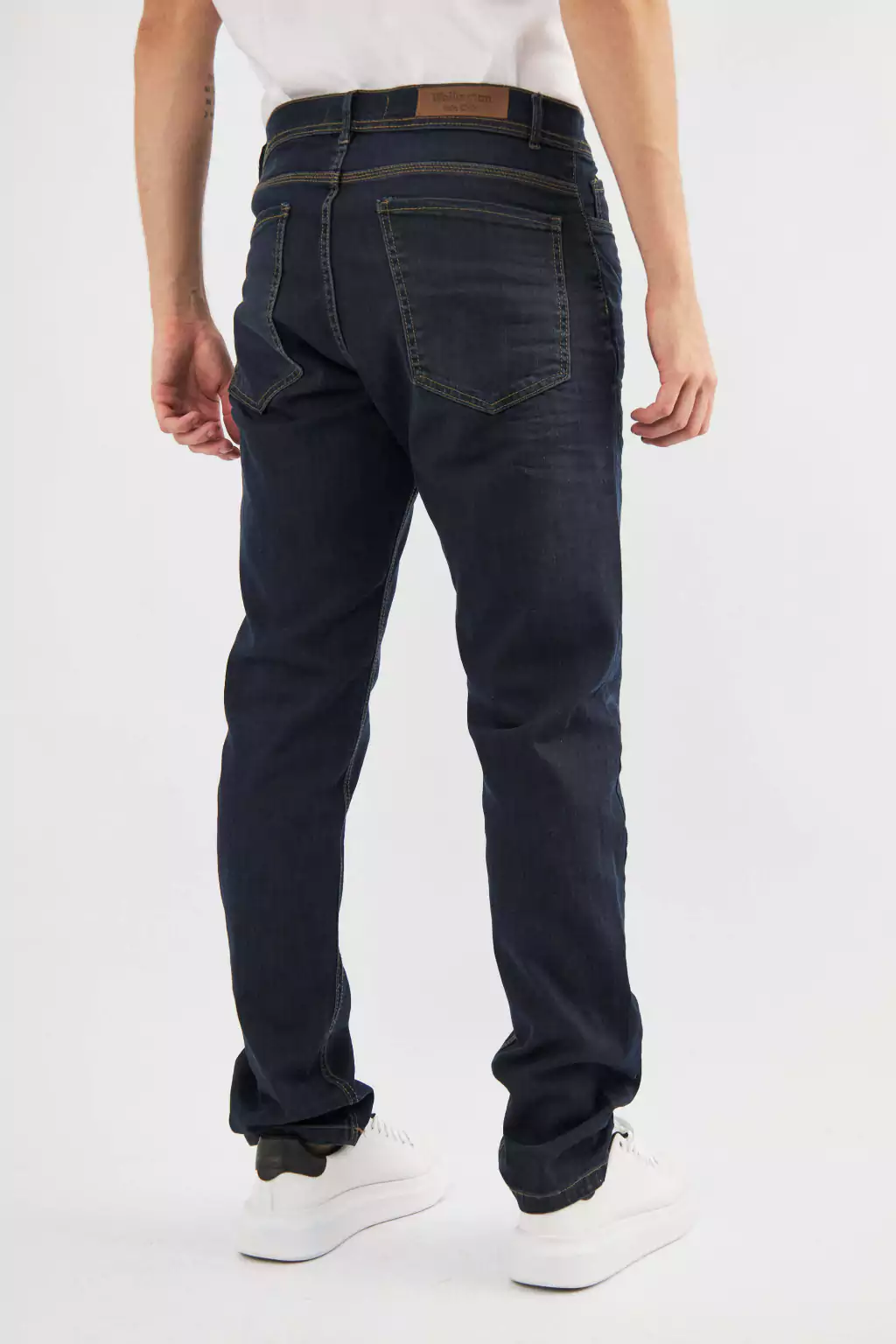 Pantalón jeans de calce regular-fit y tiro medio, confeccionado en denim con elasticidad sutil que aporta confort y amplitud de movimiento sin ceñir la silueta. Tonalidad de azul profundo con desgaste moderado en zonas localizadas. Presenta cintura con presillas, botón metálico y bragueta de cierre. Incorpora bolsillos delanteros diagonales, bolsillo relojero y dos bolsillos traseros aplicados.